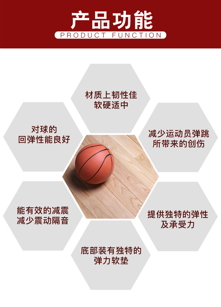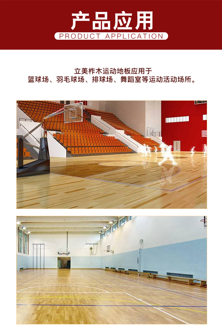 - 篮球馆:搭配 15mm 厚柞木面板 + 25mm 厚松木龙骨 + 10mm 厚弹性垫,强化冲击缓冲,适配高强度对抗运动;